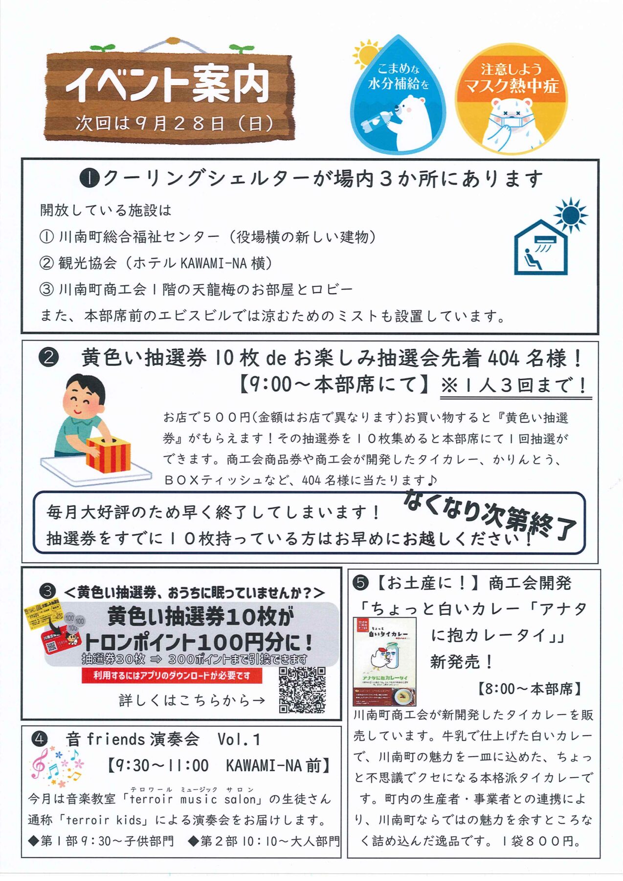 今回は定番の商工会商品券のほか、宮崎日日新聞でも紹介された商工会新開発のタイカレー「アナタに抱カレータイ」、熱中症対策グッズ、川南名物のかりんとうなどが当たります♪空くじなし!